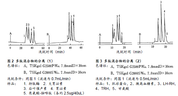 一般情況下,采用GFC法分離多肽所使用的填充劑多為TSKgel的SW硅膠型填料而非TSKgel的PW樹脂型填料。本文中將針對這些填充劑(TSKgel G2000SWXL以及TSKgel G2500PWXL)在多肽分離的應用上進行探討。