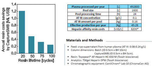從預(yù)處理血漿中捕獲AT-III通常采用肝素親和層析法。將單柱Batch工藝與Capture SMB進(jìn)行對(duì)比實(shí)驗(yàn),使用親和填料TOYOPEARL? AF-Heparin?HC-650M,用血漿上清液(AT-III0.08-0.24 g/L)進(jìn)行上樣,采用TSKgel Heparin-5PW分析柱進(jìn)行濃度測(cè)定,最終研究表明,采用Capture SMB,可使填料載量提高45%,產(chǎn)率提高38%,同時(shí)使緩沖液消耗量降低29%