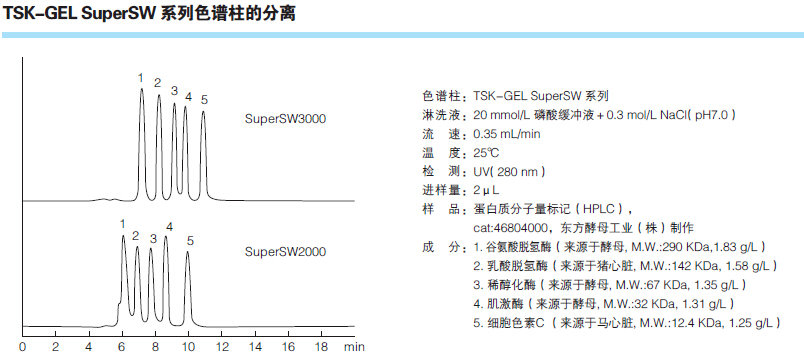 3. TSKgel SuperSW柱有內徑為4μm的顆粒,能實現最高分辨率。窄至4.6mm內徑的柱能在一定量的樣品質量范圍內提高高靈敏度。