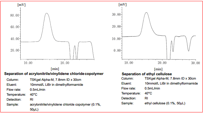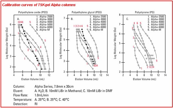 TSKgel Alpha色譜柱是專為中間極性聚合物的GPC分析所開發的產品。與PW和PWxl型色譜柱一樣,TSKgel Alpha色譜柱內的填料顆粒也具有羥基化甲基丙烯酸聚合物骨架,不過其交聯度卻高于PW和PWxl型色譜柱,從而可以將填料在極性有機溶劑中的溶脹減小到最低。它非常適合于在甲醇、乙醇、DMF、THF、HFIP、DMSO、2-丙醇和乙腈等極性有機溶劑體系下進行分析聚合物。TSKgel Alpha-M色譜柱是校正曲線線性范圍較寬的混合柱。