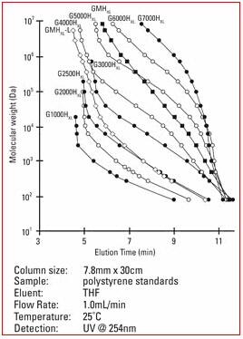 4. Hxl型柱屬于常規(guī)GPC色譜柱,尺寸為7.8mm ID ×30cm。大多數(shù)HPLC系統(tǒng)無需進(jìn)行特殊的優(yōu)化(針對柱外峰展效應(yīng)),即可使用常規(guī)的GPC色譜柱。