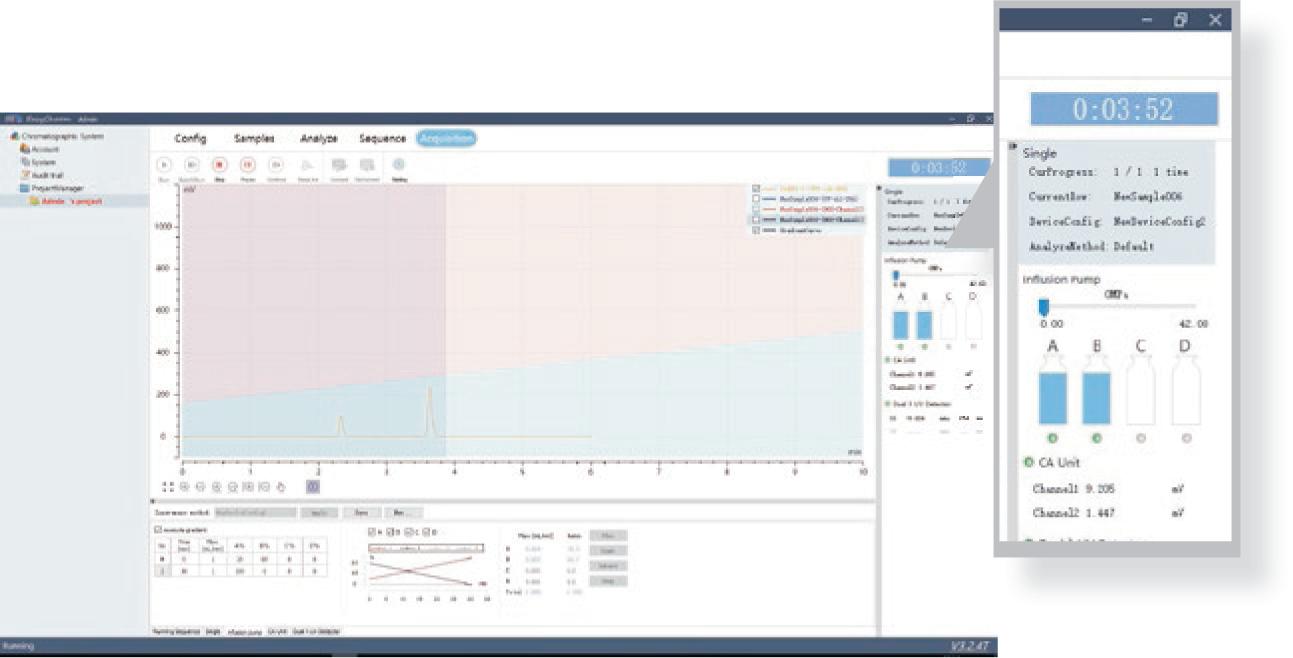 HP-3000色譜工作站是專門為制備、純化的客戶而開發的,很好的將儀器控制和譜圖處理進行了融合,整體界面簡潔清楚,一目了然。針對制備色譜的要求,去除了部分繁瑣的譜圖處理功能使之更適合與制備。