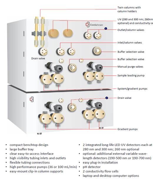 ChromaCon公司位于瑞士蘇黎世,是一家致力于層析設(shè)備及層析技術(shù)開(kāi)發(fā)的企業(yè),其自主研發(fā)的Contichrom系列層析系統(tǒng),為一系列可用于連續(xù)純化的全自動(dòng)層析系統(tǒng)。
