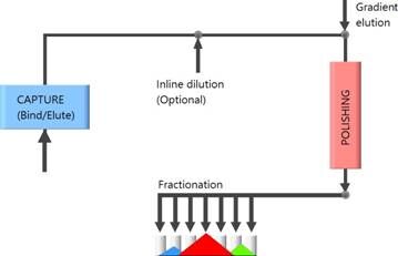 Contichrom系統(tǒng)可以將兩個(gè)層析步驟(例如捕獲和精純)整合為一個(gè)單一的過(guò)程,第一步層析洗脫的產(chǎn)物可以直接被稀釋,從而直接進(jìn)行第二步層析,因此省略了中間的間歇過(guò)程,這是非常適用于高生產(chǎn)量純化的。