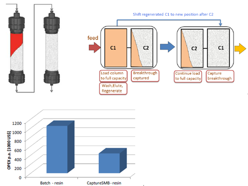 傳統(tǒng)層析工藝,由于流穿效應(yīng),有30-50%的填料是無(wú)法被完全利用的,從而使得載量和處理量大為受限。Capture SMB用于優(yōu)化捕獲環(huán)節(jié),作為最簡(jiǎn)單和最強(qiáng)大的2柱位設(shè)計(jì),可使純化效率顯著提高,并且使填料用量大為縮減。