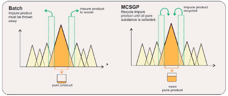 MCSGPMulticolumn Countercurrent Solvent Gradient Purification)用于精純環(huán)節(jié),無(wú)需通過(guò)耗時(shí)的實(shí)驗(yàn)設(shè)計(jì)(DoE)確定工藝條件,可有效克服典型SMB(模擬移動(dòng)床)僅適用于二元分離、無(wú)法實(shí)現(xiàn)線性梯度的缺點(diǎn)。