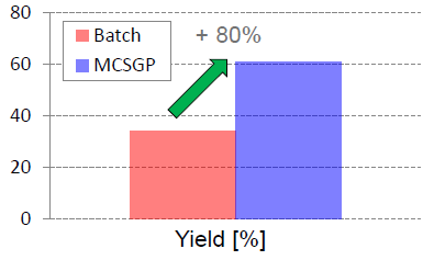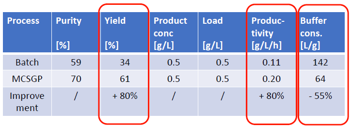 MCSGP可將產(chǎn)品純度從傳統(tǒng)工藝的59%提升至70%,將收率從傳統(tǒng)工藝的34%提升至61%,從而使產(chǎn)量(g /L /h)整體提升80%,并同時(shí)使Buffer的消耗量降低55%MCSGP工藝,無(wú)疑可顯著地節(jié)約成本投入,并可產(chǎn)生更多的生產(chǎn)效益。