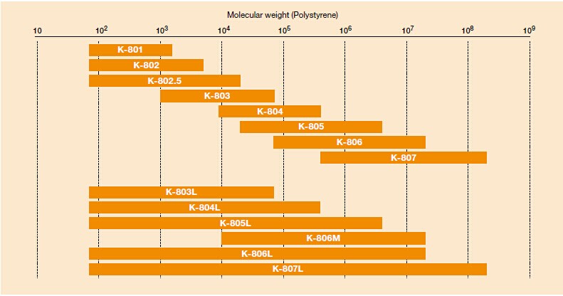 GPC K-803L是標(biāo)準(zhǔn)的油溶性SEC色譜柱,適用于從低分子量到高分子量的寬范圍的樣品。GPC KF-803L色譜柱是適合分子量分布廣的樣品的混合填料色譜柱。流動(dòng)相是氯仿。