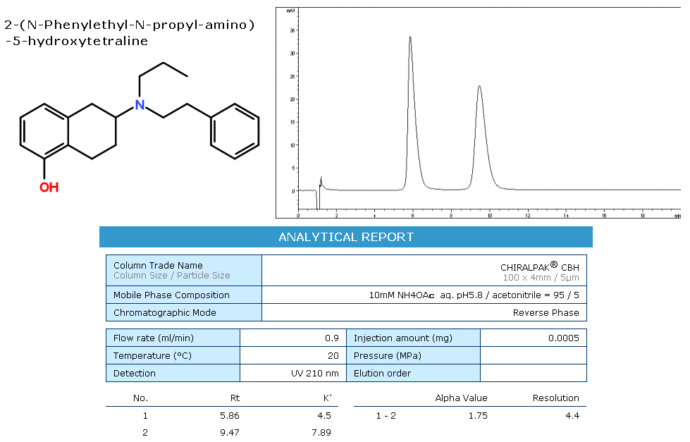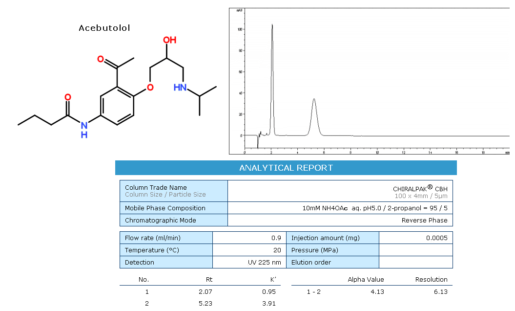 CBH為蛋白質鍵合型手性柱,硅膠表面共價鍵合有纖維二糖水解酶。適用于反相系統。適用分離的化合物范圍:有苯環結構的伯胺和仲胺類化合物。若分子結構中含有氫鍵基團,例如羰基、醇羥基、酰胺、亞砜等基團,將會帶來更好的對映體選擇性。