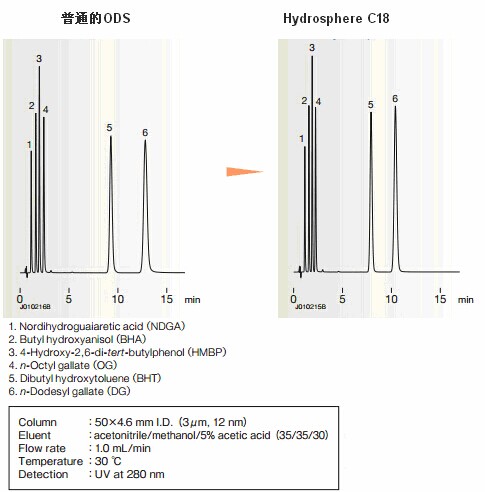 Hydrosphere C18色譜柱與普通的ODS色譜柱相比,通常可縮短20%左右的分析時間。